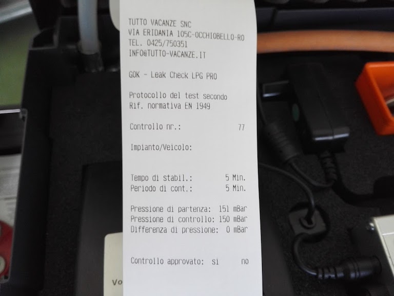La prova consiste nel mettere in pressione tutto l’impianto gas, a partire dal regolatore di pressione fino a tutti gli apparecchi a gas all’interno del veicolo, e verificare che non ci siano cadute di pressione dal livello del test iniziale.